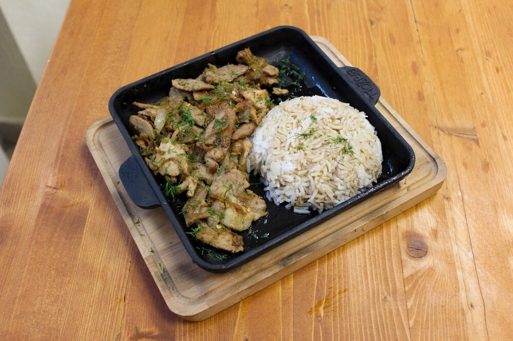 Жареная грудинка с острым перцем и рисом, подаётся со свежими огурцами в рассоле