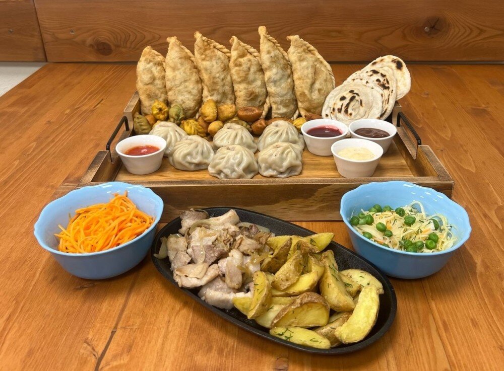 В набор входит: Буузы с говядиной 4 штуки, таёжные 2 штуки, оленина 2 штуки. Хушуры с мясом 2 штуки. Жареха по-бурятски 1 порция. Бин и шаобин. Салат Витаминный 1 порция, морковь по корейски 1 порция. Соуса: соевый, чесночный и остро-сладкий по 1 порции. Чай монгольский пакетированный 2 пакета.