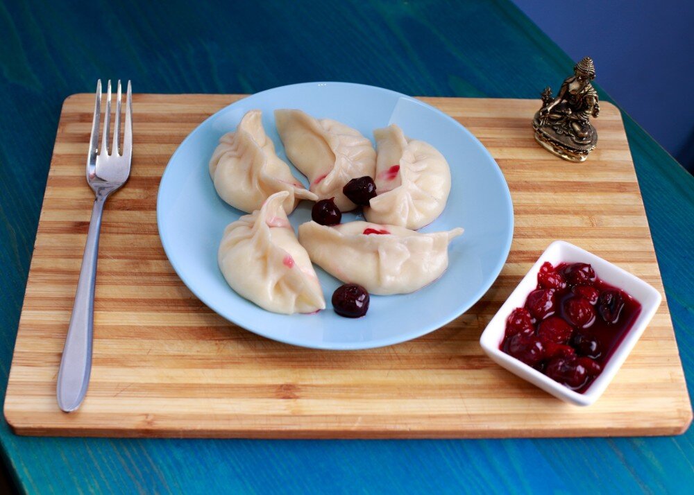 Пельмени из прозрачного теста с начинкой из творога со сладким вишнёвым соусом